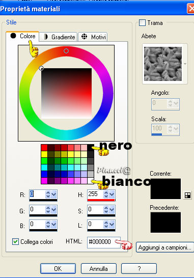 per selezionare il nero, clicca sul primo quadretto in alto a destra (HTML #000000).
