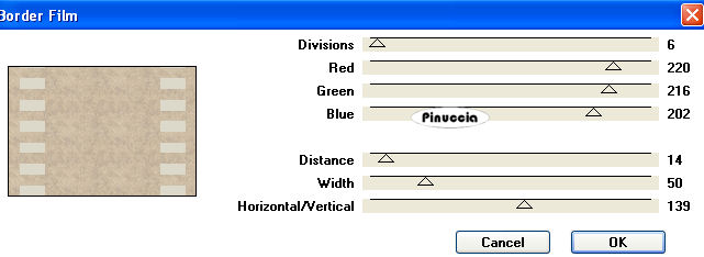qui puoi trovare qualche risposta ai tuoi dubbi. Se l'argomento che ti interessa non è presente, ti prego di segnalarmelo. Questo tutorial è stato scritto con PSP X, ma può essere eseguito anche con le altre versioni di PSP. Il copyright del tutorial appartiene a Laguna Azul. Il copyright della traduzione è mio. Il copyright dei tubes e delle immagini è dei rispettivi artisti. Per favore, rispetta il lavoro degli autori. Occorrente: Materiale qui Filtri: Filters Unlimited 2.0 qui Graphics Plus qui Alf's Border FX qui Andrew's Filters 4 qui Per usare i filtri Andrew's, bisogna prima convertirli (vedi qui, e poi importarli in Filters Unlimited qui) Metti la Maschera Corel_07_005 nella cartella Maschere. Apri il font Beachman Script e minimizzalo nella tua area di lavoro. Lo troverai nella lista dei font disponibili, quando ti servirà. Apri i motivi wp_damask040 e Goldfill1 e minimizzali nella tua area di lavoro. Li troverai nella lista dei motivi disponibili, quando ti serviranno. 1. Apri una nuova immagine trasparente 680 x 470 pixels. Scegli dal tuo tube un colore chiaro come colore di primo piano (#d7c5b5), e un colore scuro come colore di sfondo (#5b382d). Passa il colore di primo piano a Gradiente di primo piano/sfondo: ![]() Riempi l'immagine trasparente con il gradiente.Livelli>Duplica. Effetti>Plugins>Filters Unlimited 2.0, Andrew's 4 - Squeeze Through the Gap, con i seguenti settaggi: ![]() per non appesantire il filtro, ho importato soltanto l'effetto che mi serviva per eseguire il tutorial. Immagine>Rifletti. Cambia la modalità di miscelatura di questo livello in Luminanza. Livelli>Duplica e chiudi il livello. 2. Attiva il livello centrale. Apri il tube Mtm-Retro-bis 5-small-15 jan 2008, e vai a Modifica>copia. Torna al tuo lavoro e vai a Modifica>Incolla come nuovo livello. Cambia la modalità di miscelatura di questo livello in Luce netta. 3. Attiva nuovamente il livello superiore e rendilo nuovamente visibile. Livelli>Carica/Salva maschera>Carica maschera da disco. Cerca e carica la maschera Corel_07_005, con i seguenti settaggi: ![]() Livelli>Unisci>Unisci gruppo. Effetti>Effetti 3D>Sfalsa ombra, con i seguenti settaggi, colore nero: ![]() Livelli>Unisci>Unisci visibile. ![]() 4. Immagine>Ridimensiona, all'85%, tutti i livelli non selezionato. Regola>Messa a fuoco>Metti a fuoco. 5. Livelli>Nuovo livello raster. Livelli>Disponi>Sposta giù. Apri il file di sfondo wp_damask_040 e impostalo come Motivo di primo piano. ![]() Riempi il livello con questo motivo.Livelli>Duplica. 6. Livelli>Nuovo livello raster. Riporta il colore di primo piano al Gradiente del punto 1, e riempi il livello con il gradiente.Cambia la modalità di miscelatura di questo livello in Luce netta. 7. Attiva il secondo livello dal basso ![]() e trascinalo in cima ai livelli. ![]() (puoi anche fare: Livelli>Disponi>Porta in alto). Effetti>Plugins>Alf's Border FX - Border Film, con i seguenti settaggi: ![]() Attiva lo strumento Bacchetta magica , sfumatura e tolleranza 0,![]() e seleziona i 12 piccoli rettangoli. ![]() Selezione>Inverti. Premi sulla tastiera il tasto CANC ![]() Selezione>Deseleziona. Effetti>Effetti di immagine>Scostamento: ![]() Cambia la modalità di miscelatura di questo livello in Moltiplica. Effetti>Effetti 3D>Sfalsa ombra, con i settaggi precedenti. 8. Apri il tube am-divider4, e vai a Modifica>copia. Torna al tuo lavoro e vai a Modifica>Incolla come nuovo livello. Effetti>Effetti di immagine>Scostamento: ![]() Livelli>Duplica. Immagine>Ruota per gradi - 45 gradi a sinistra: ![]() Regola>Messa a fuoco>Metti a fuoco. Spostalo nell'angolo in alto a sinistra.Attiva il secondo livello dall'alto. Effetti>Effetti 3D>Sfalsa ombra, con i settaggi precedenti. Attiva il livello superiore e ripeti l'Effetto Sfalsa ombra. 9. Apri il tube la_kette+anhänger. Il tube è composto da vari livelli: tre ciondoli, la catena divisa in due livelli e il livello di sfondo. Chiudi il livello di sfondo, scegli un ciondolo e chiudi i livelli degli altri due ciondoli. ![]() Modifica>Copia Unione. Torna al tuo lavoro e vai a Modifica>Incolla come nuovo livello. Sposta la collana a destra, vedi il mio esempio.Effetti>Effetti 3d>Sfalsa ombra, con i seguenti settaggi, colore nero: ![]() 10. Apri il tube natur85-misted by dragonblu070507, e vai a Modifica>Copia. Torna al tuo lavoro e vai a Modifica>Incolla come nuovo livello. Immagine>Ridimensiona, all'80%, tutti i livelli non selezionato. Regola>Messa a fuoco>Metti a fuoco. Spostalo nell'angolo in basso a sinistra.11. Apri il tube 15874698-pf_01, e vai a Modifica>Copia. Torna al tuo lavoro e vai a Modifica>Incolla come nuovo livello. Immagine>Ridimensiona, al 70%, tutti i livelli non selezionato. Cambia la modalità di miscelatura di questo livello in Moltiplica. Sposta anche questo tube nell'angolo in basso a sinistra.12. Livelli>Nuovo livello raster. Riempi il livello con il gradiente del punto 1.Selezione>Seleziona tutto. Selezione>Modifica>Contrai di 3 pixels. Premi sulla tastiera il tasto canc. Selezione>Inverti. Effetti>Plugins>Graphics Plus - Cross Shadow, con i settaggi standard. ![]() Mantieni selezionato. 13. Selezione>Inverti. Livelli>nuovo livello raster. Riempi con il colore di sfondo.Selezione>modifica>Contrai, di 9 pixels. Premi sulla tastiera il tasto CANC. Mantieni ancora selezionato. Livelli>Nuovo livello raster. Riempi con il gradiente del punto 1.Selezione>modifica>Contrai, di 3 pixels. Premi sulla tastiera il tasto CANC. Selezione>Deseleziona. Effetti>Plugins>Graphics Plus - Cross Shadow, con i settaggi standard. Effetti>Effetti 3D>Sfalsa ombra, con i settaggi usati al punto 3. ![]() 14. Attiva il terzo livello dall'alto. Effetti>Effetti 3D>Sfalsa ombra, con i settaggi precedenti. Attiva il secondo livello dall'alto e cambia la modalità di miscelatura in Luce netta. 15. Apri il motivo Goldfill1, e impostalo come motivo di sfondo. ![]() Cambia il colore di primo piano con il colore di sfondo. Attiva lo strumento Testo , con i seguenti sett