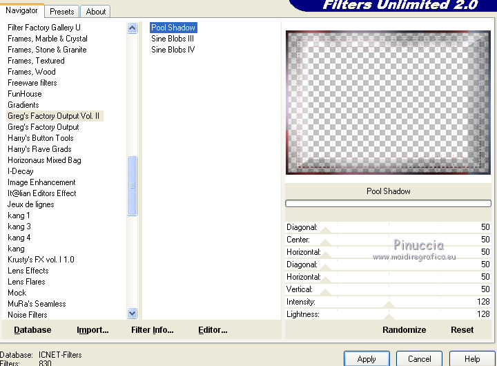 14. Effects>Plugins>Filters Unlimited 2.0 - Greg's Factory Output vol.II - Pool Shadow, default setting.