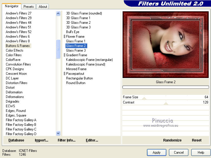 13. Effetti>Plugins>Filters Unlimited 2.0 - Buttons &Frames - Glass frame 2, con i settaggi standard.