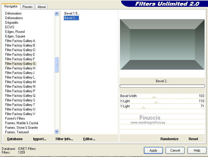 2. Effets>Modules Externes>Filters Unlimited 2.0 - Filter Factory Gallery G - Bevel 2.