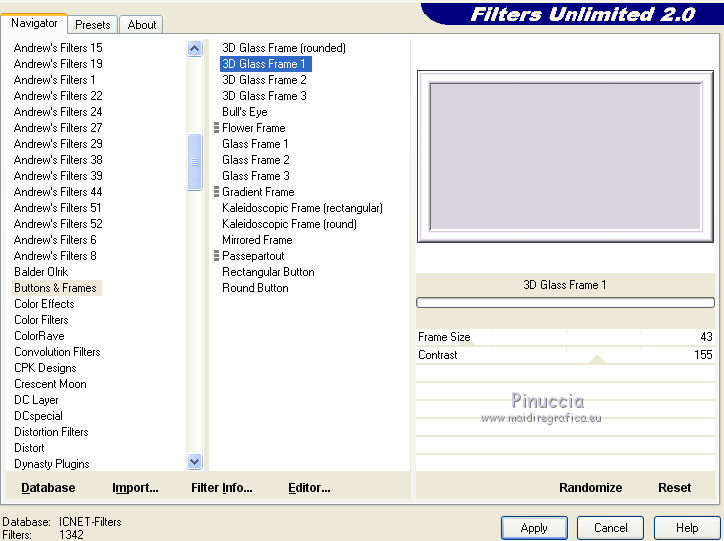 6. Effetti>Plugins>Filters Unlimited 2.0 - Buttons & Frames - 3D Glass Frame 1.