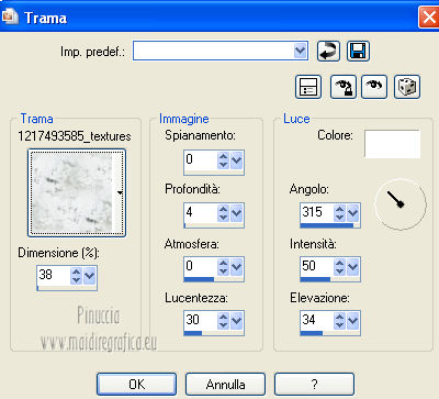 15. Effetti>Effetti di trama>Trama - seleziona la trama 1217493585-texture, con i seguenti settaggi