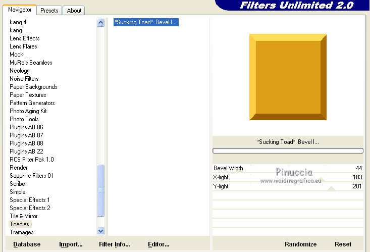 Effetti>Plugins>Filters Unlimited - Toadies - Sucking Toad Bevel I, con i settaggi standard.