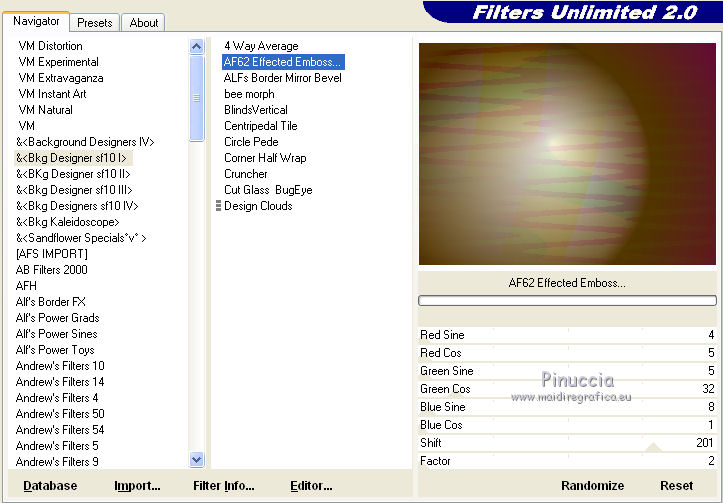 Effetti>Plugins>Filters Unlimited 2.0 - BKG Designersf10I - AF62 Effected Emboss, con i settaggi standard.