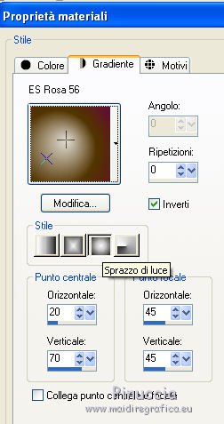 Passa il colore di primo piano a Gradiente, e seleziona il gradiente ES Rosa 56, con i seguenti settaggi.