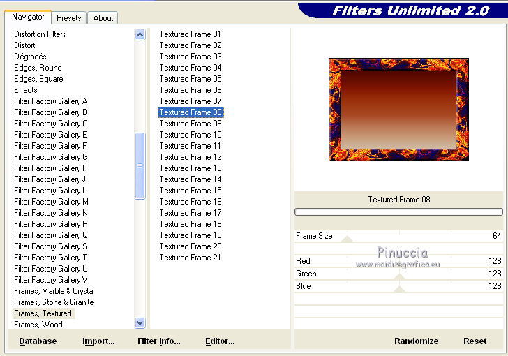 Effetti>Plugins>Filters Unlimited - Frames Textures - Textured Frame 08, con i settaggi standard.