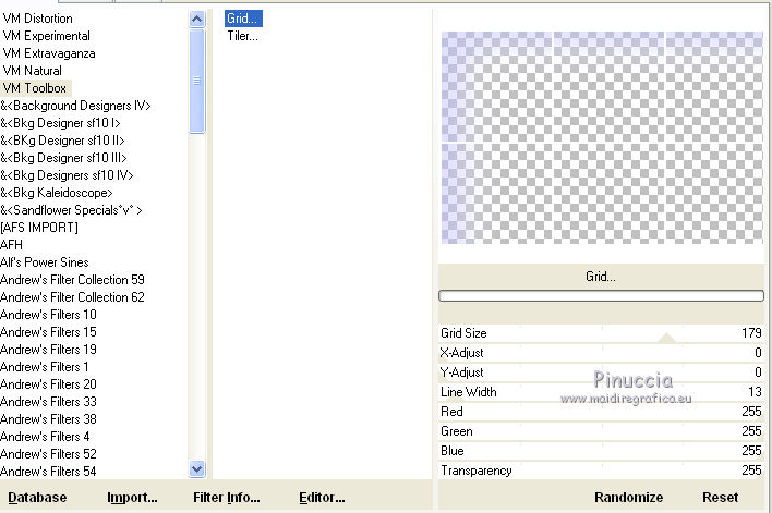 Effetti>Plugins>Filters Unlimited - VM Toolbox - Grid, con i seguenti settaggi.
