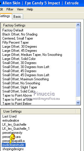 Metti il preset pudicitiaextrude nella cartella del filtro. : Alien Skin Eye Candy 5 Impact>Settings>Extrude. Se preferisci puoi importarlo, quando ti servirà, dalla cartella in cui hai scompattato il materiale.