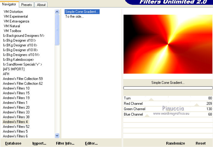 Effetti>Plugins>Filters Unlimited - Andrew's Filter collection 4 - Simple Cone Gradient, con i settaggi standard.