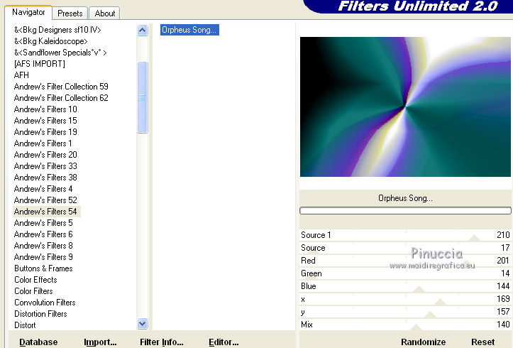 Effetti>Plugins>Filters Unlimited - Andrew's Filter collection 54 - Orpheus Song, con i settaggi standard.