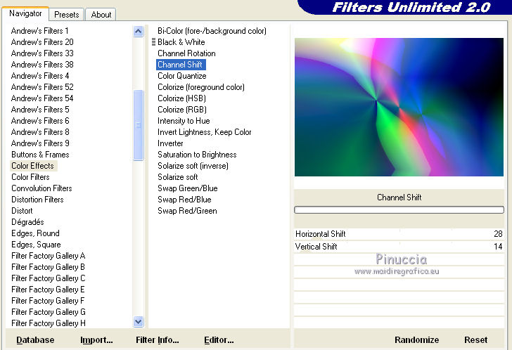 Effetti>Plugins>Filters Unlimited - Color Effects - Channel Shift con i settaggi standard.