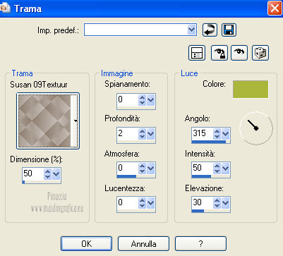 12. Effetti>Effetti di trama>Trama - seleziona la trama Susan09Textuur, con i seguenti settaggi.