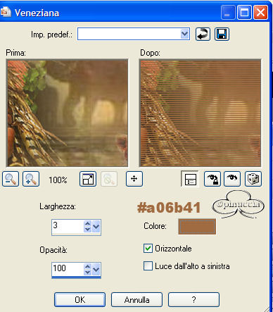 13. Livelli>Effetti di trama>Veneziana, con i seguenti settaggi, e con il colore di sfondo.