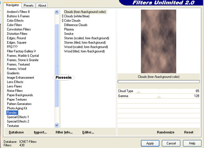 20. Effetti>Plugins>Filters Unlimited 2.0 - Render - Clouds (fore-/background color), con i settaggi standard: