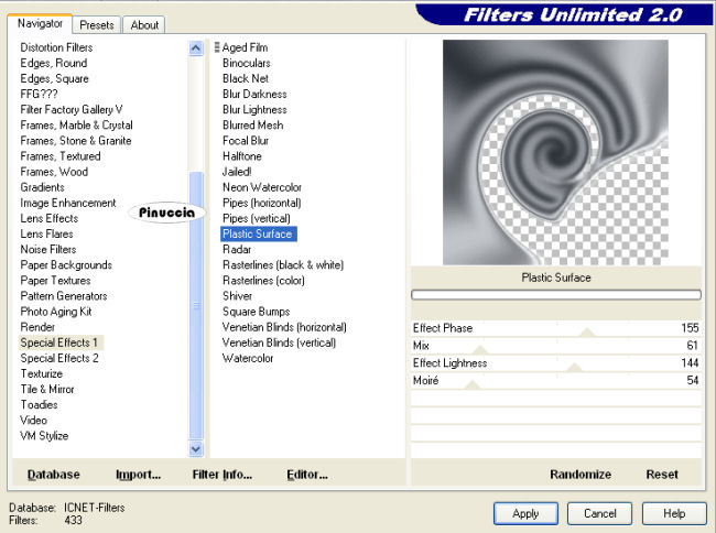 10. Effetti>Plugins>Filters Unlimited - Special Effects 1 - Plastic Surface, con i settaggi standard: