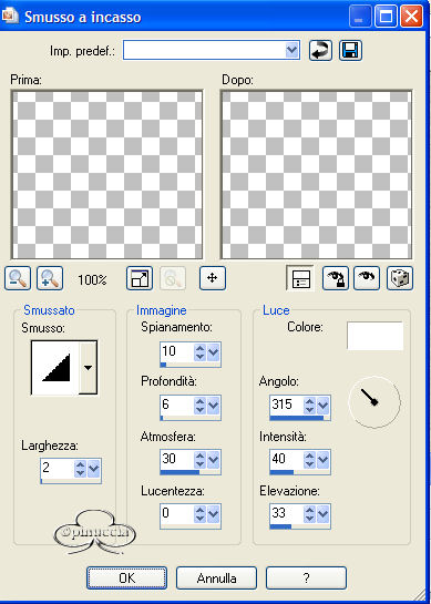 Effetti>Effetti 3D>Smusso a incasso, con i seguenti settaggi: