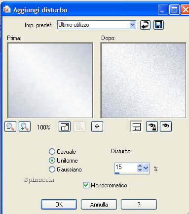 6. Regola>Aggiungi/rimuovi disturbo>Aggiungi disturbo, con i seguenti settaggi: