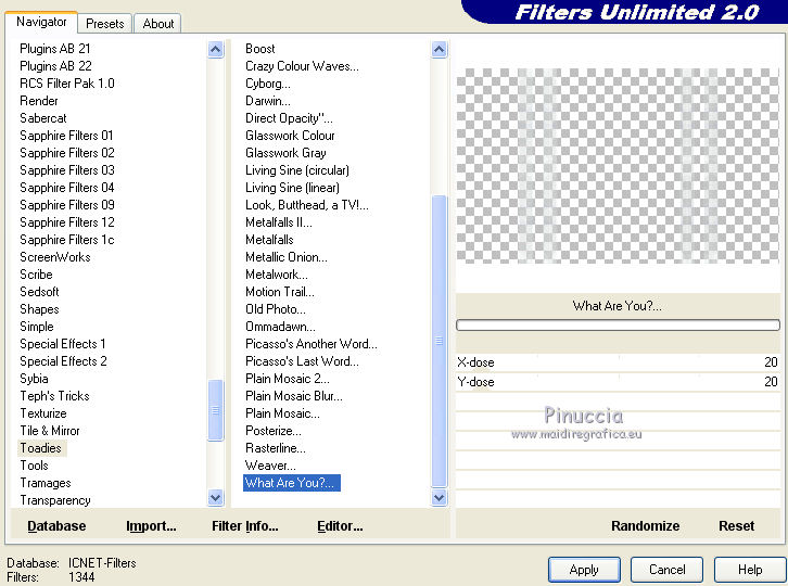 15. Effetti>Plugins>Filters Unlimited 2.0 - Toadies - What are you, con i settaggi standard.