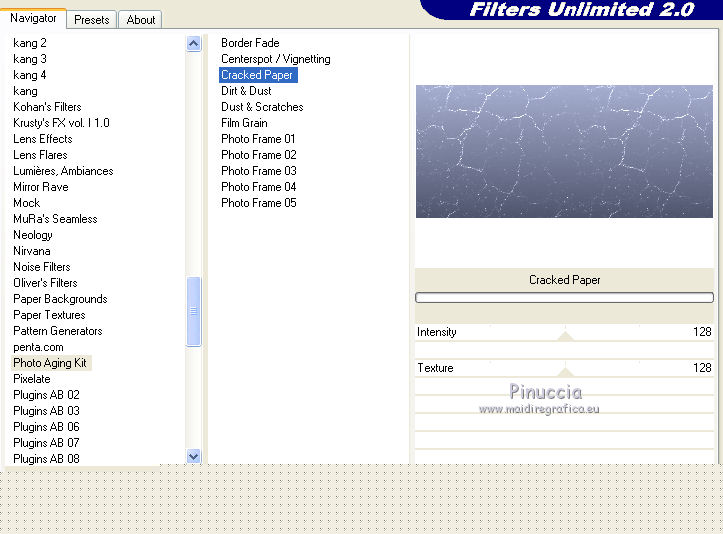 Effetti>Plugins>Filters Unlimited 2.0 - PhotoAging Kit - Cracked Paper, con i settaggi standard.