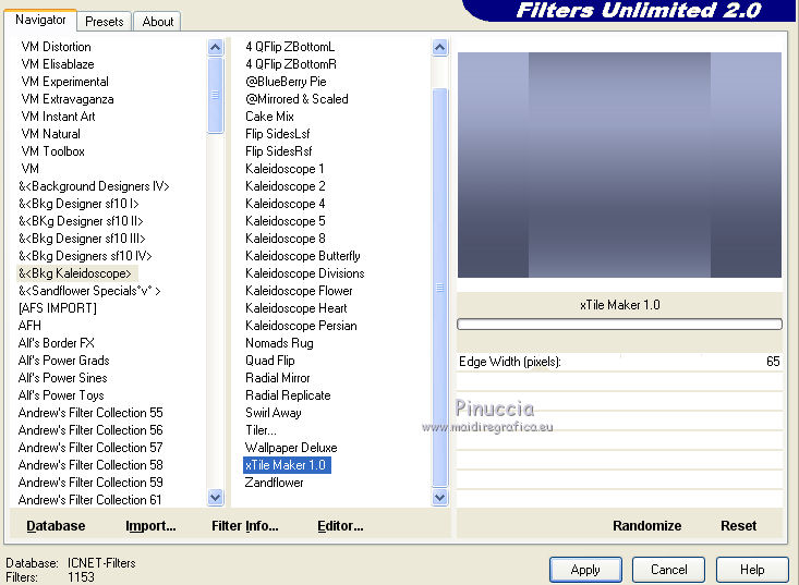 Effetti>Plugins>Filters Unlimited 2.0 - &<BKg Kaleidoscope> - x Tile Maker 1.0.