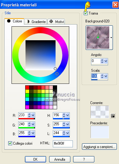 Attiva la paletta del colore di sfondo, seleziona Trama e imposta la trama Background-020 con i seguenti settaggi.