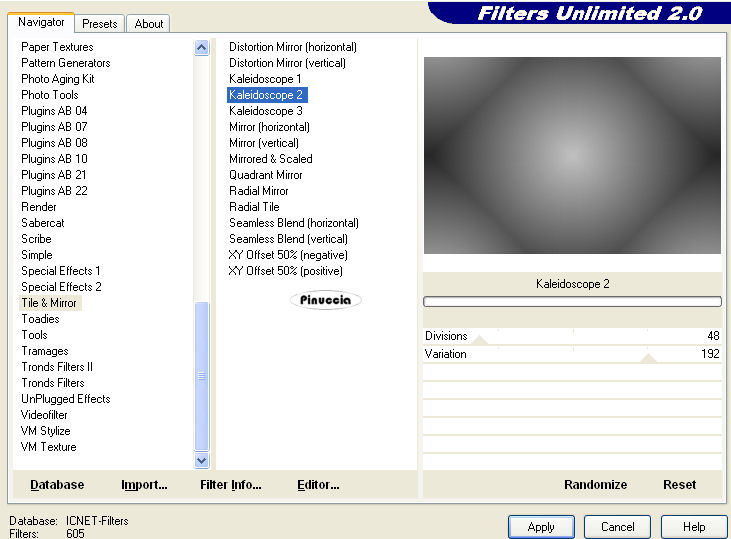 4. Effetti>Plugins>Filters Unlimited 2.0 - Tile & Mirror - Kaleidoscope 2: