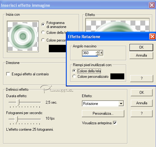 Imposta i settaggi per l'effetto "rotazione", quindi clicca su Personalizza e imposta l'angolo massimo a 360 gradi, colore della tela.