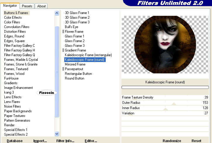 11. Effetti>Plugins>Filters Unlimited 2.0 - Buttons & Frames, Kaleidoscop Frame (round).