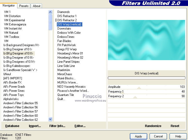 5. Effets>Modules Externes>Filters Unlimited 2.0 - &<Bkg Designer sf10II> - DIS Warp (vertical), settaggi standard