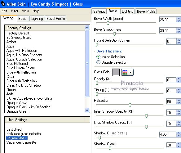 19. Effets>Modules Externes>Alien Skin Eye Candy 5 Impact - Glass, preset Seyran-Glass.