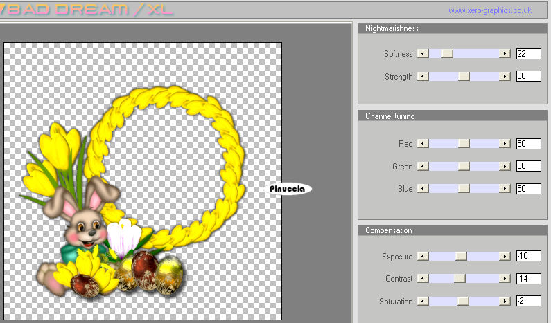Per questo testo è stato usato il font Brush Script Std, Frohe Ostern dimensione 48, il testo del testo dimensione 36 (con PSP 9; dovrai regolare le dimensioni a seconda del testo e della versione di PSP che stai usando).