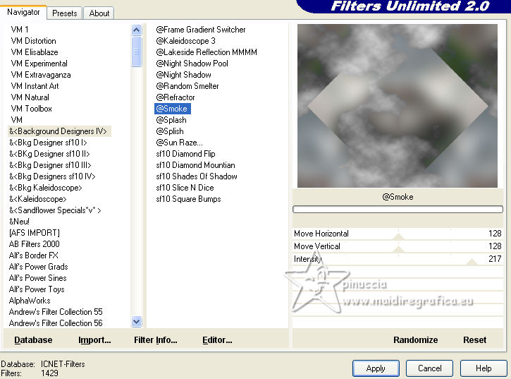 6. Effets>Modules Externes>Filters Unlimited 2.0 - &<Background DesignersIV> - @Smoke, par défaut