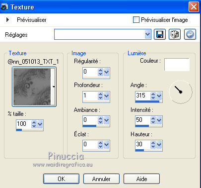 9. Effets>Effets de textures>Texture - sélectionner la texture @ann_051013_TXT_144_tdstudio.bmp, avec ces règlages.
