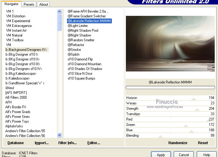 4. Effetti>Plugins>Filters Unlimited 2.0 - &<Background Designers IV> - @Lakeside Reflections MMMM