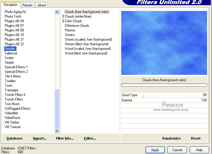 17. Effetti>Plugins>Filters Unlimited - Render - Clouds(fore-/background), con i settaggi standard.