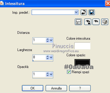 7. Effetti>Effetti di trama>Trama - seleziona la trama Tratteggio fine con i seguenti settaggi.