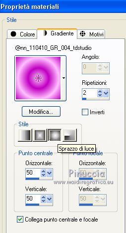 Passa il colore di primo piano a Gradiente, e seleziona il gradiente @nn_110410_GR_004_tdstudio, stile Sprazzo di luce.