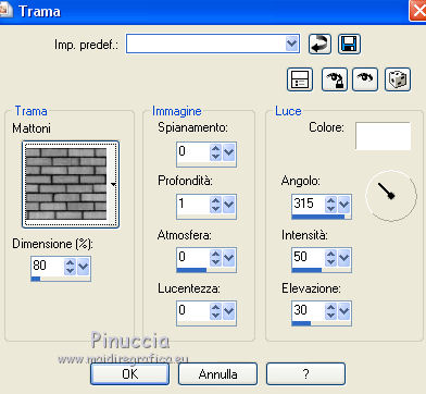 3. Effetti>Effetti di trama>Trama - seleziona la trama Mattoni, con i seguenti settaggi.