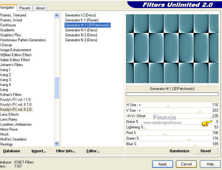 5. Effetti>Plugins>Filters Unlimited 2.0 - Krusty's FX vol. ll 2.0, Generator M-1 (3D Patchwork)