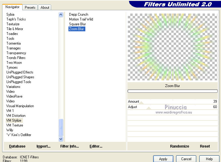 15. Effetti>Plugins>Filters Unlimited 2.0 - VM Stylize - Zoom blur, con i settaggi standard.