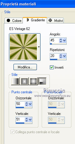 1. Passa il colore di primo piano a Gradiente, e seleziona il gradiente ES Vintage 62, con i seguenti settaggi.
