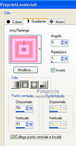 1. Passa il colore di primo piano a Gradiente, e seleziona il gradiente mcq Flamingo, con i seguenti settaggi.
