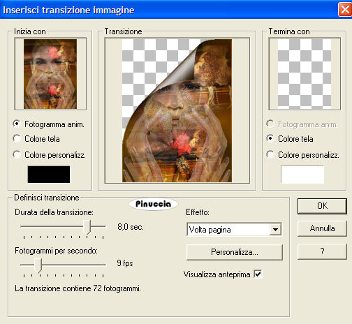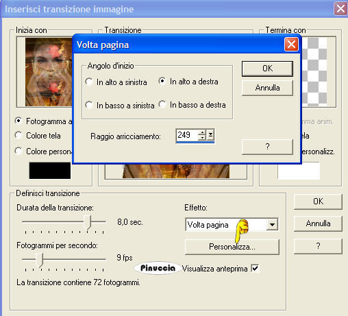 Effetti>Effetti transizione immagine - voltapagina, con i seguenti settaggi: