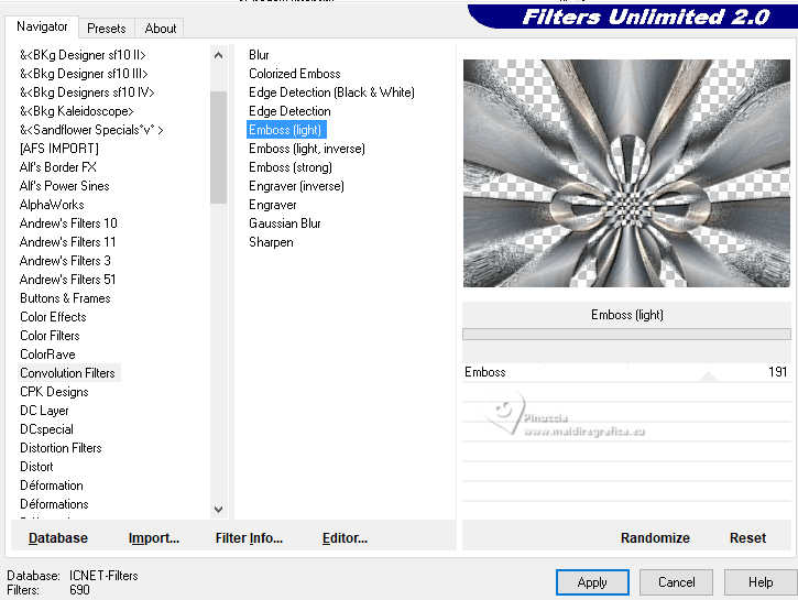 11. Effects>Plugins>Filters Unlimited 2.0 - Emboss (light), default settings.