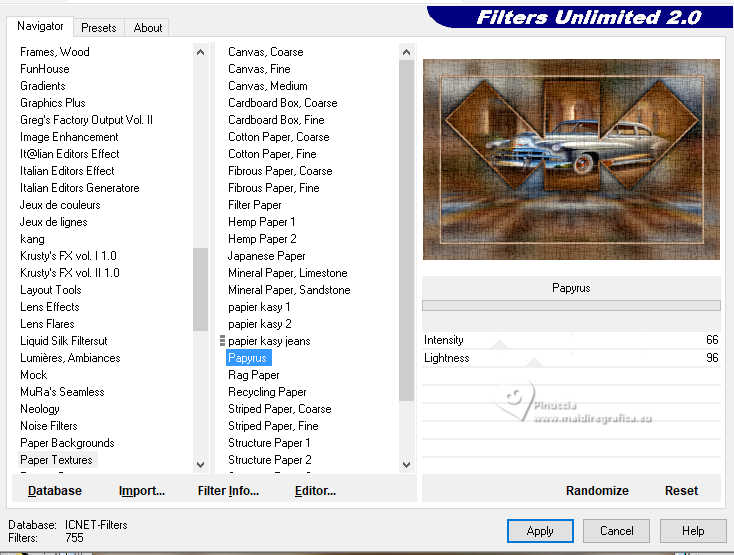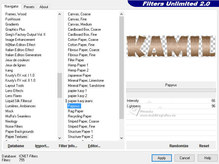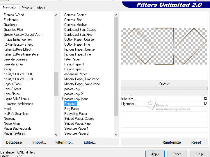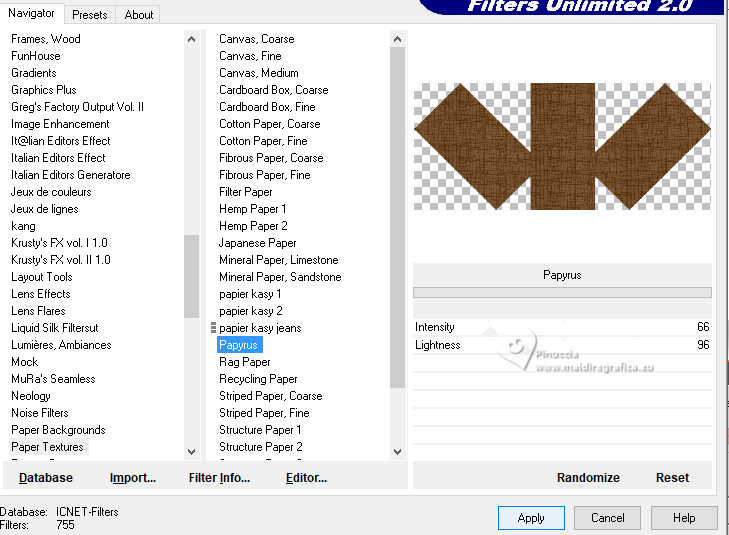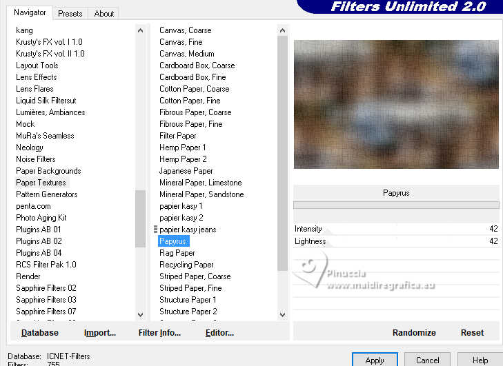 Repeat Effects>Plugins>Filters Unlimited 2.0 - Paper Textures - Papyrus