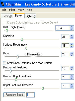 Ho usato il filtro Eye Candy 5 Nature - Snow Drift, con i seguenti settaggi: