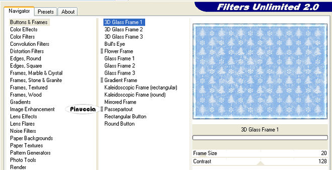3. Effetti>Plugins>Filters Unlimited 2.0 - Buttons and Frames - 3D Glass Frame 1 - Frame size impostato su 20: