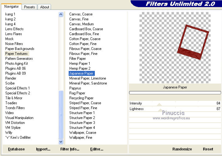 29. Effetti>Plugins>Filters Unlimited - Paper Texture - Japanese frame, con i settaggi precedenti.