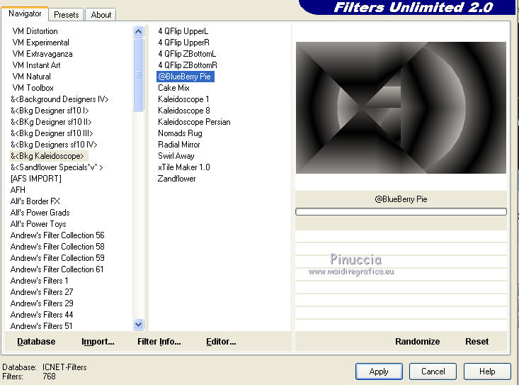 Effetti>Plugins>Filters Unlimited 2.0 - &<Bkg Kaleidoscope> - @BlueBerry Pie, con i settaggi standard.
